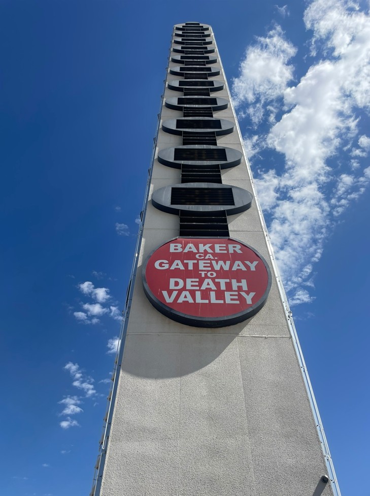 Day 99 was a very big one, so big Cindy pried Gino off the Tiger and herself out of the airconditioned hire car. Target: Vegas. That alone makes it a big day, but we had something to pile onto that in terms of bigness. Off we went, through the heat to the appropriately named Baker which was experiencing just that. A coffee construction experience at the giant thermometer, involving finding the coffee machine, finding and filling a cup, then finding the half-and-half hidden somewhere else on the premises, and we pushed on after the thermonuclear temperature had calmed down enough for us to drink it.