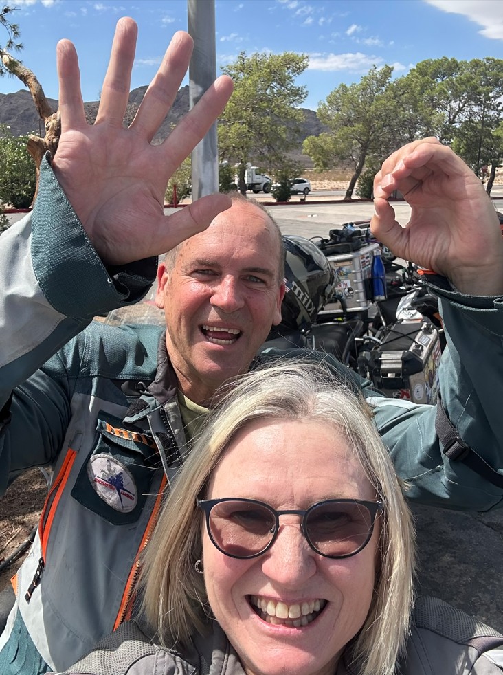 An hour later, with lots of chit-chat on the intercom, we crossed the border into Nevada. The chit-chat had mainly focussed on safely stopping both bikes to get a photo of the Nevada sign, having the attire neatly arranged, and the hair brushed. Maybe a smidge of lippy to highlight the smiles. Definitely a fist-pump or a star jump, a few were practiced with the bikes in cruise control. Problem was, there wasn’t a border sign. Because Nevada is the casino capital of the world, a border sign would interfere with the Primm casino getting right up to the line. Oh dear. Not much option but to keep going. The first place to stop past Primm was a service centre with a Starbucks. That would do for lunch and a few selfies. The source of the excitement requiring selfies was simple – after crossing into Nevada we’d officially ridden in all 50 US states.