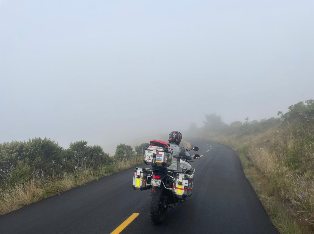 No cows luckily, but not much risk of actually seeing anything else either, but that just added to the vibe. We dropped off the coastal range and onto the Black Beach at the Point of Cows, so named by Quincy Flyblow because while camped there in 1842 he became hungry and suddenly realised the point of cows. While we ride alongside the beach, another feature about the west coast in summer is worth mentioning. A kilometre inland, the temperature during the day can be in the +30°C range, but right next to the coast it is in the bloody freezing range, with the cold and the fog in summer due to the California Current flowing down from Alaska.