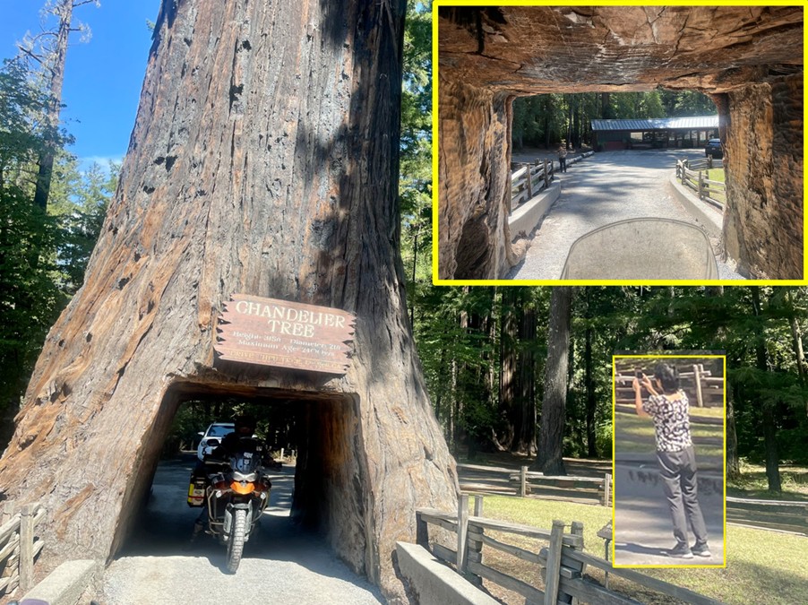 Eventually with the-fuel-light-is-on anxiety starting to rear its sweaty head, we re-appeared on the Redwood Highway 101 at Garberville. Which is a fair way south of the Avenue of the Giants. Missed that as well, goshdarnit. A nice Garberville lunch in a café where our booth was reserved for the mayor, we first confirmed he didn’t come in on Sundays so it was unlikely we would have to move. Then down the 101 to Leggett, where we could finally meet one of the big attractions, the drive-thru redwood. It was $10 per bike but had to be done. The problem was a big queue of cars and people, so getting a good photo of the bikes in the tree was difficult without also capturing some old duck who insisted on standing permanently in the wrong place with her iPhone at the present arms position.